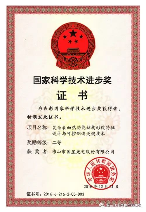 据悉,“复杂表面热功能结构形貌特征设计与可控制造关键技术”是国星光电联合华南理工大学等五单位,历时16年的理论与技术研究发明的。作为该技术项目排名第三的完成单位,国星光电主要研发出基于PCB的大功率LED器件等新型器件封装结构及制造技术,重点解决了大功率LED器件、模块和灯具的材料、热控等关键问题,在器件封装结构方面突破了国外专利壁垒,技术达到国际领先水平。