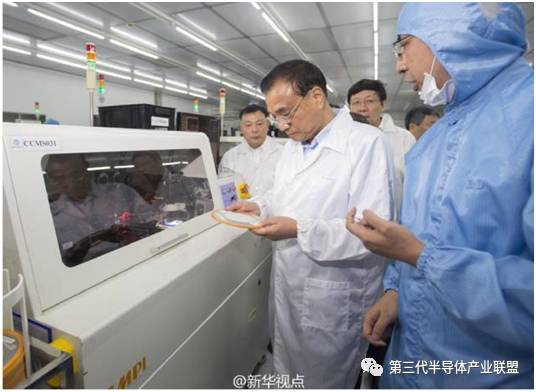 在分选车间,总理手拿4英寸硅衬底80*80milLED芯片圆片仔细端详,当公司副总裁梁伏波介绍这样一颗芯片最大功率可以用到12W,可以发出相当于2个60W白炽灯的光通量时,称赞道:“能做到这么大的功率,很不错!”
