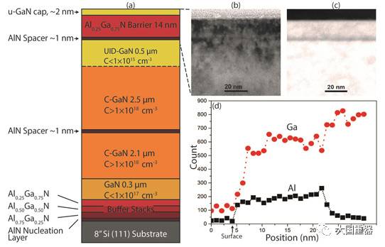 图(a)横截面结构。(b)HEMT顶部80nm的透射电子显微镜(TEM)成像。暗灰色层表示表面开始处。(c)HEMT顶部80nm的扫描透射电子显微镜(STEM)成像。表面开始于黑色层下,暗色层是AlN。(d)顶部25nm能谱仪(EDS)化学分析。4nm以前数值均为表面的背景环境值。