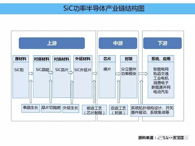 按照从材料至最终应用的划分,SiC功率半导体产业链主要包括衬底、外延、器件与模块、应用等产业环节。