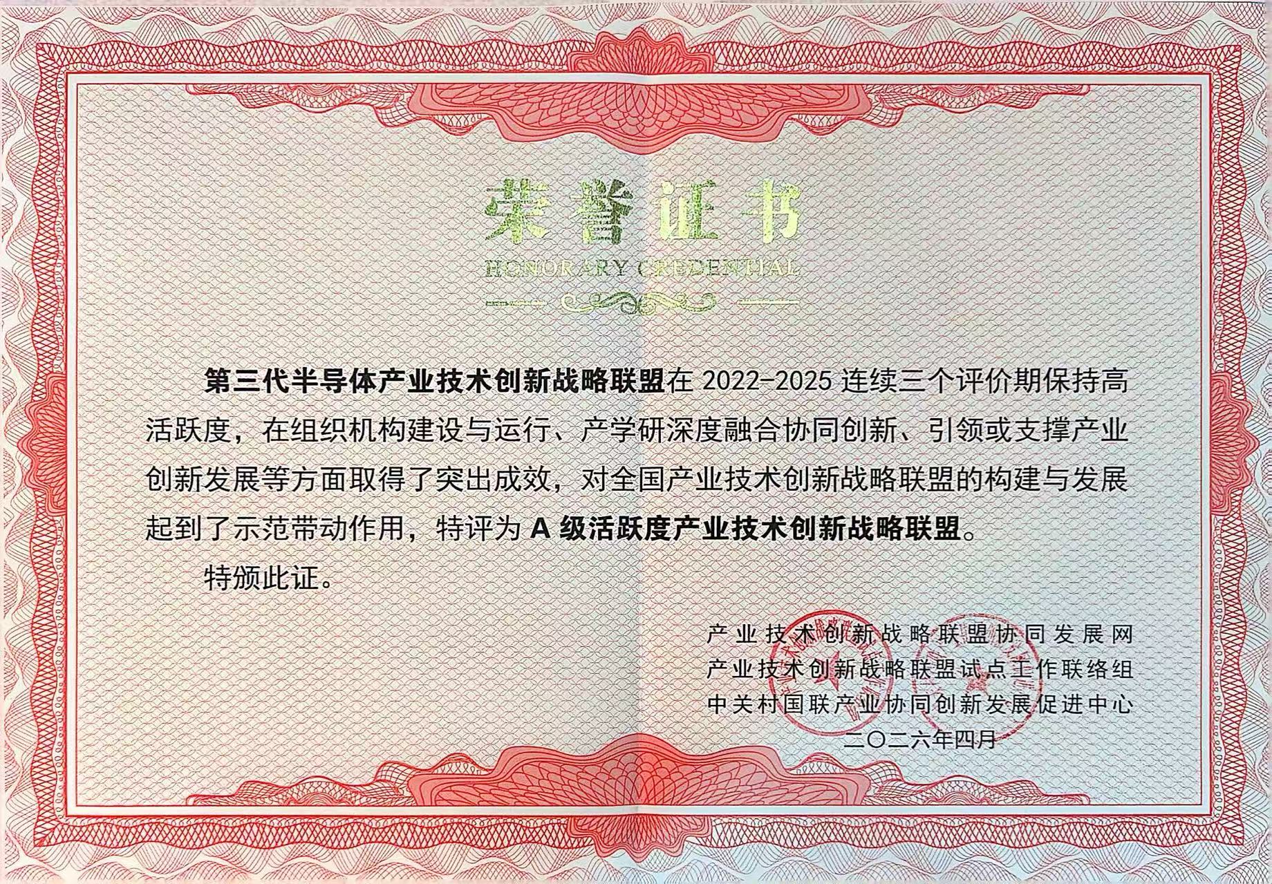 4 月 24 日,《2025 年度产业技术创新战略联盟活跃度评价报告》发布会在北京隆重召开。第三代半导体产业技术创新战略联盟凭借2022-2025 连续三个评价期的卓越表现与持续高活跃度,从众多联盟中脱颖而出,成功入选26家高活跃度联盟名单,稳居科技部试点联盟 “活跃度高的联盟” 第一方阵,正式获评 “A级活跃度产业技术创新战略联盟”。