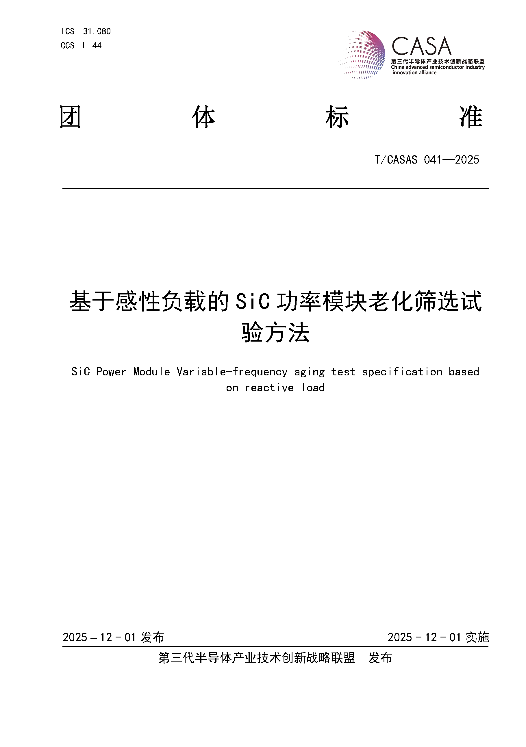 由智新半导体有限公司牵头制定,遵循CASAS标准制定流程,经过标准起草小组会议讨论、广泛征求意见、委员会草案投票等流程,团体标准T/CASAS 041—2025《基于感性负载的SiC功率模块老化筛选试验方法》于2025年12月1日正式面向产业发布。
