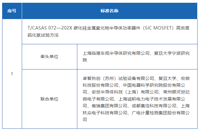 2025年11月24日,按照第三代半导体产业技术创新战略联盟标准化委员会(CASAS)相关管理办法,经CASAS管理委员会投票通过由上海临港车规半导体研究有限公司、复旦大学宁波研究院联合牵头提出的《碳化硅金属氧化物半导体功率器件(SiC MOSFET)高浓度硫化氢试验方法》团体标准立项建议,详细信息如下: