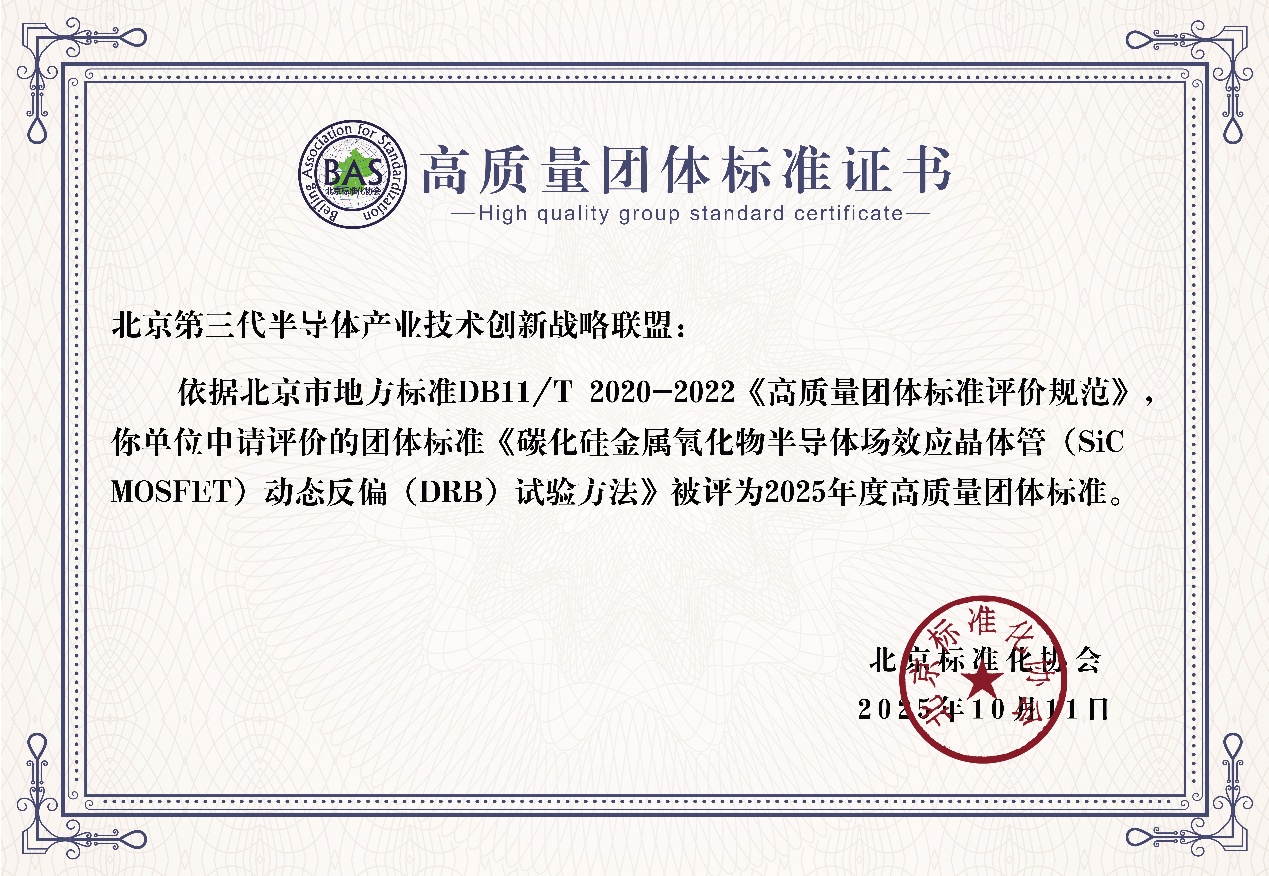 10月11日,在北京市市场监督管理局主办的“在京全国标委会与北京市重点产业企业对接会成果发布暨第56届世界标准日主题活动”上,在成果发布环节,第三代半导体产业技术创新战略联盟发布的T/CASAS 046—2024《碳化硅金属氧化物半导体场效应晶体管(SiC MOSFET)动态反偏(DRB)试验方法》团体标准,被评为2025年度高质量团体标准。