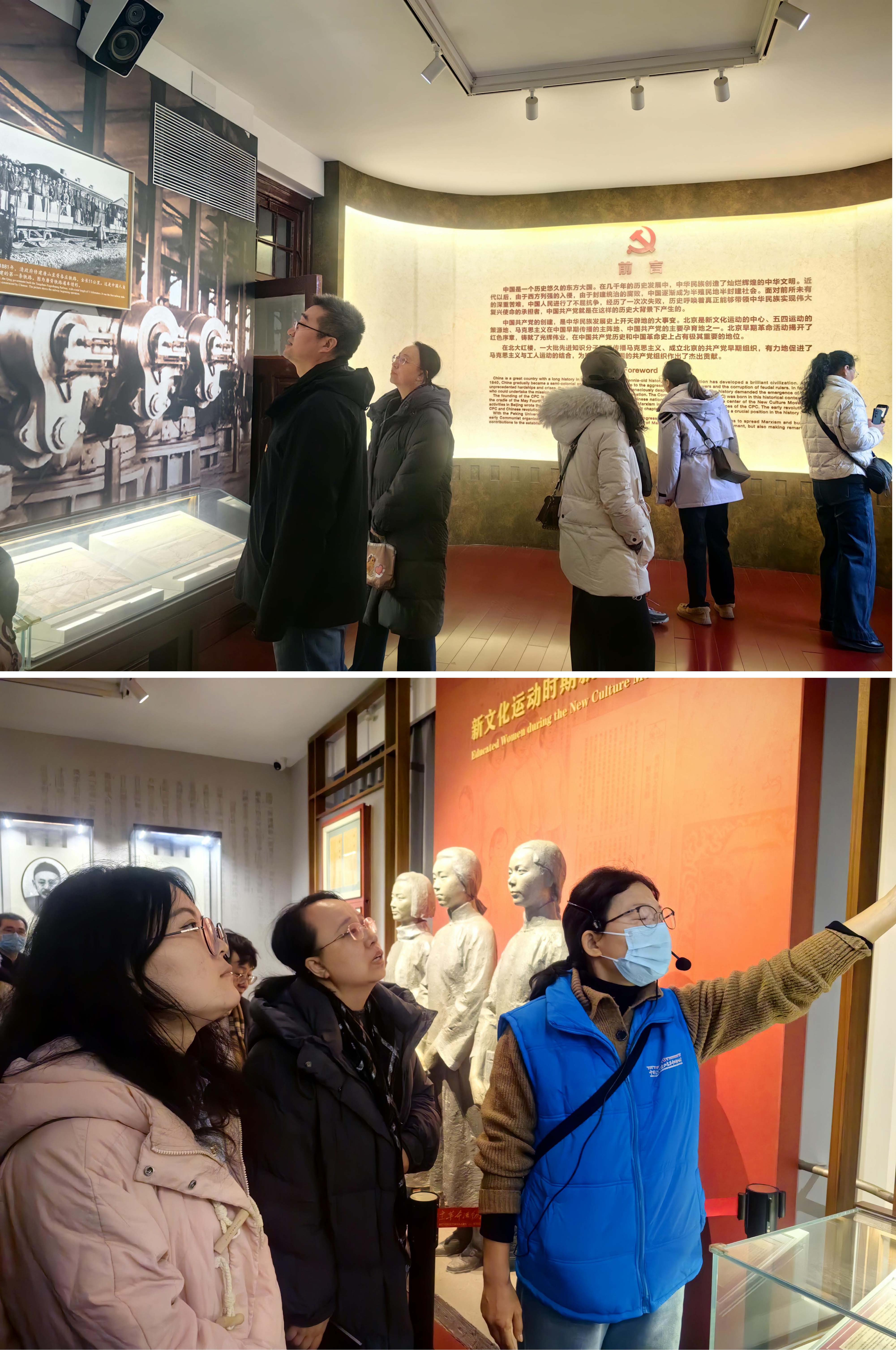 大家跟随北大红楼讲解员参观“新文化运动展厅”、“五四运动展厅”、“马克思主义传播展厅”等展区,讲解员通过对展陈文字、实物背景、场景复原等细节的讲述,感受到组建中国共产党的艰辛历程,红楼之内,复原的李大钊办公室、陈独秀编辑部,泛黄的《新青年》刊物、珍贵的历史照片,无声诉说着百年前那段波澜壮阔的革命岁月。